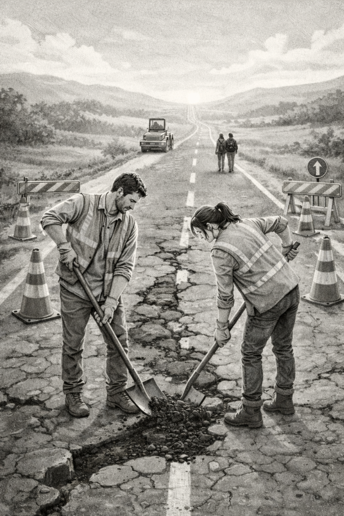 A házaspáros közös utunk olyan, mint egy gondosan épített műút. Kezdetben sima, egyenes, könnyen járható. Örömmel lépünk rá, és tele vagyunk reménnyel, hogy rajta haladva eljutunk közös végcélunkhoz. Ám, ahogy az idő múlik, az út felszínén repedések keletkezhetnek, az idő és az élet viharai nyomot hagyhatnak rajta, és ha nem figyelünk, kátyúk jelenhetnek meg, amelyek akadályozhatják az előrehaladást.